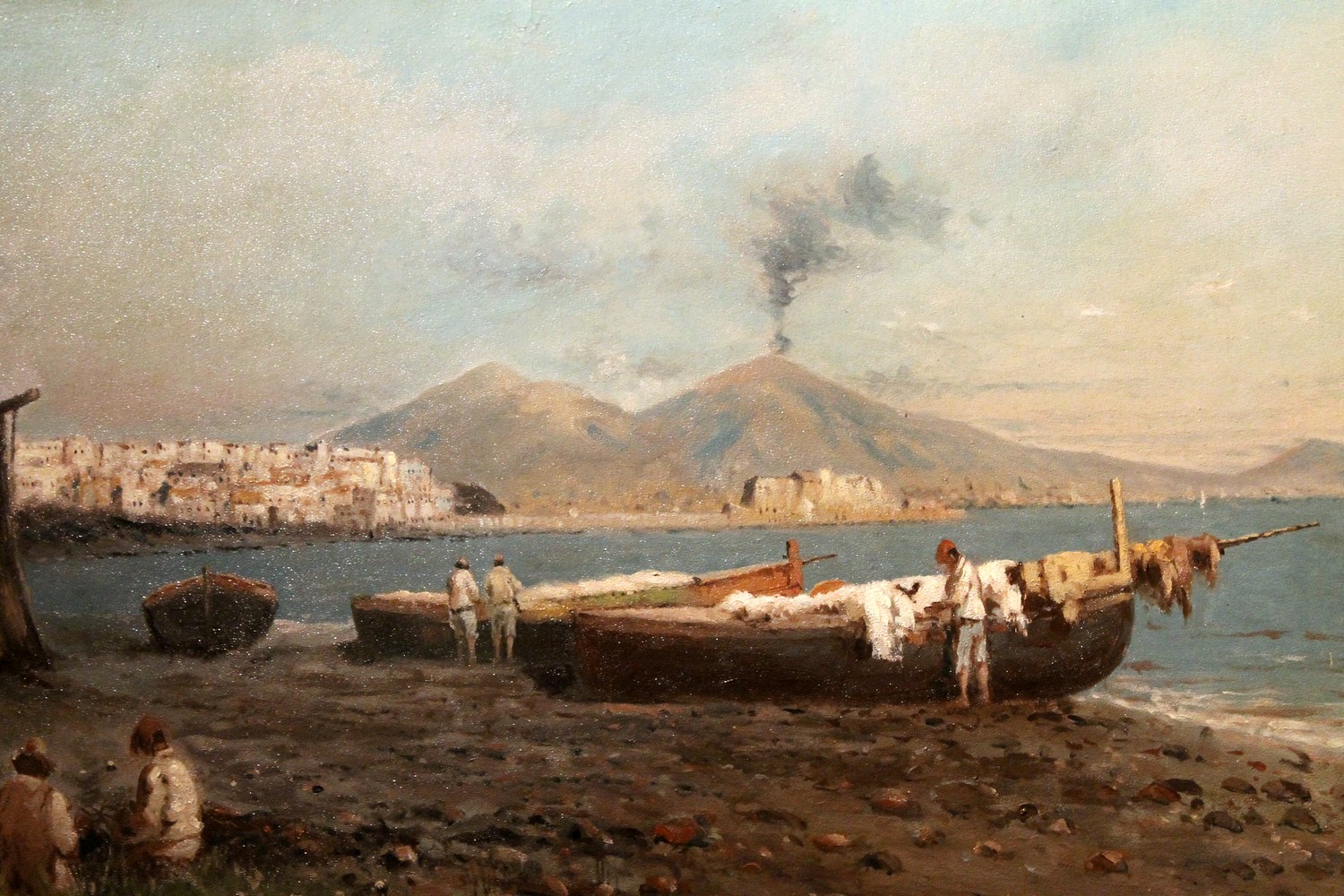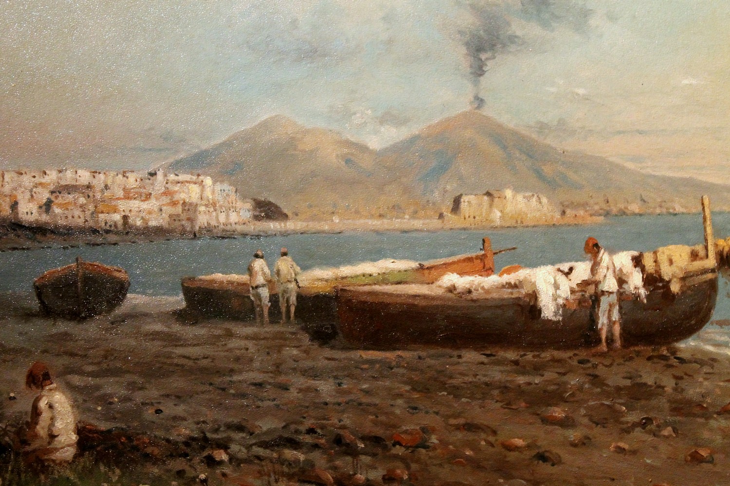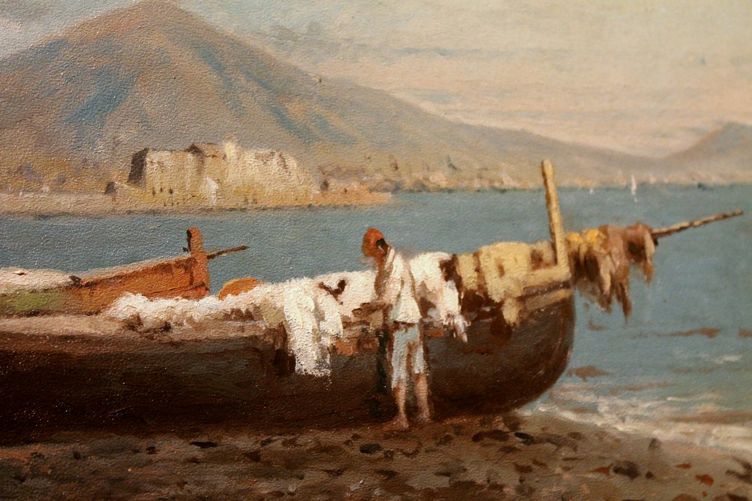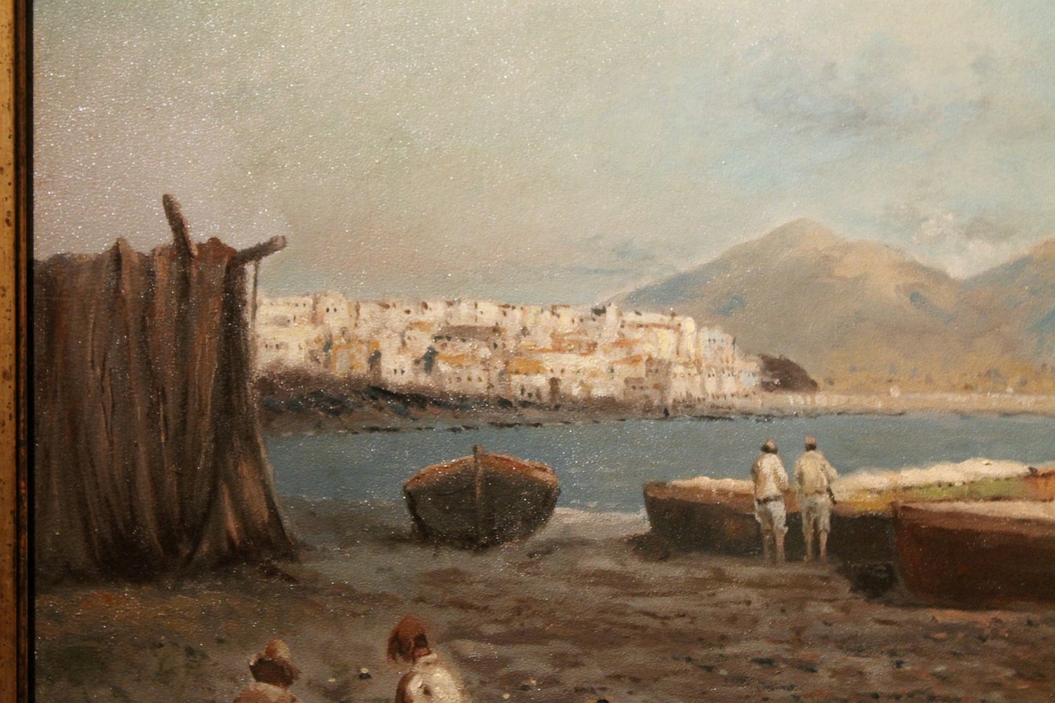 We love the neutral and natural color palette the painter used to photograph a moment of daily life in a seaside village in the bay of Naples and the wonderful texture. The marine landscape fills us with calm, numerous shades of blue, gray, green and brown are painted with strong brushstrokes that give this view a wonderful texture, lively and compact at the same time. The impressionist oil painting is very realistic but the painter manages to immerse the viewer in an evocative and romantic atmosphere with late afternoon light reflecting on the sea and the autumnal tones fine touches of white gouache pick out the light. The fishermen seem to have ended their fishing day, some are untangling their nets and others are taking care of their boats the landscape is dominated by Vesuvius in the background surrounding the bay.