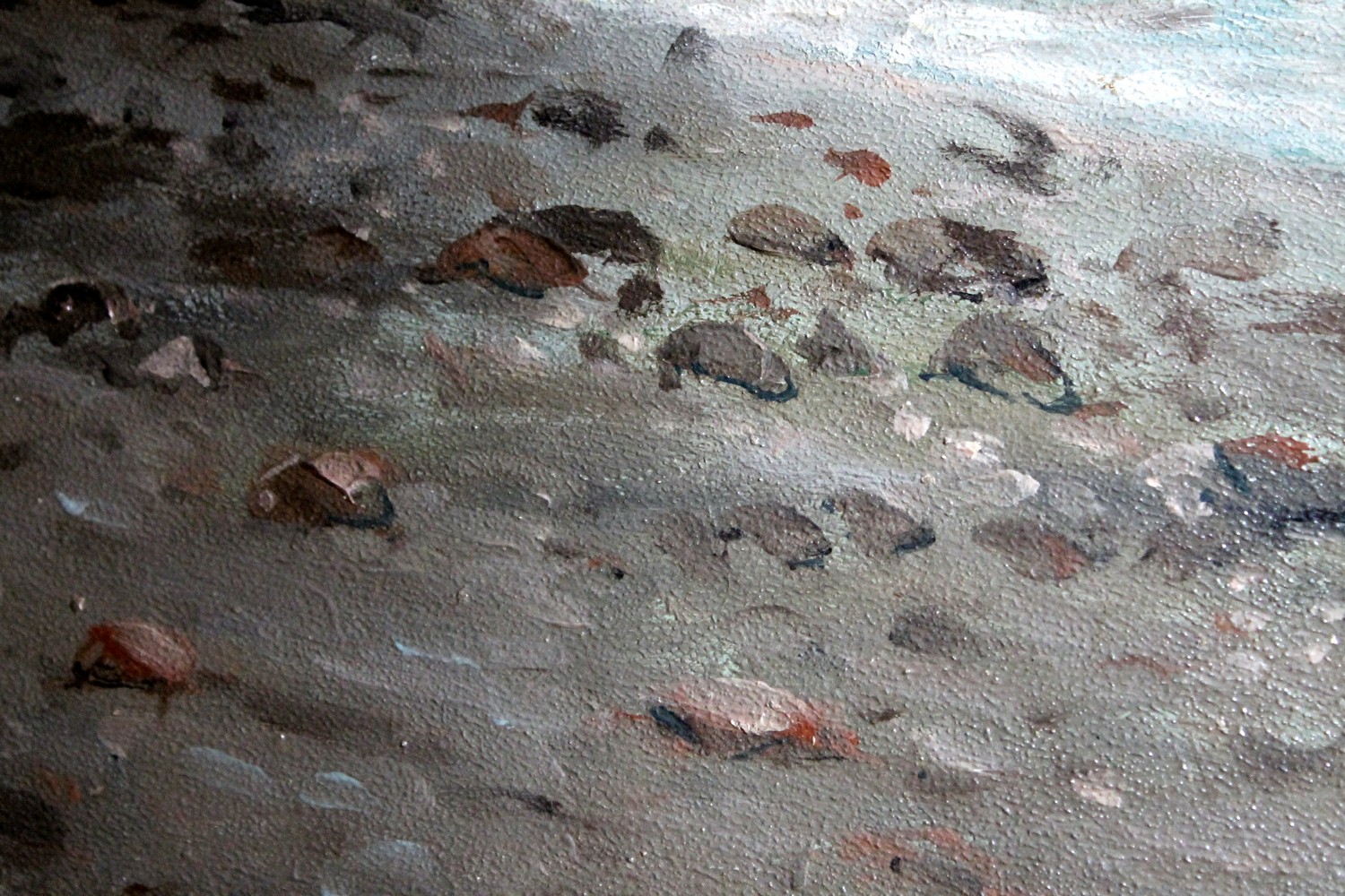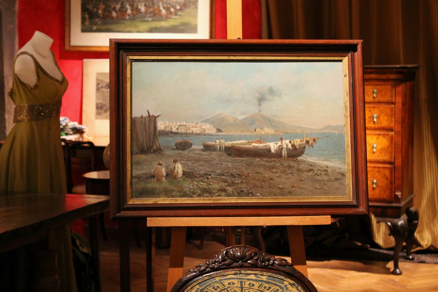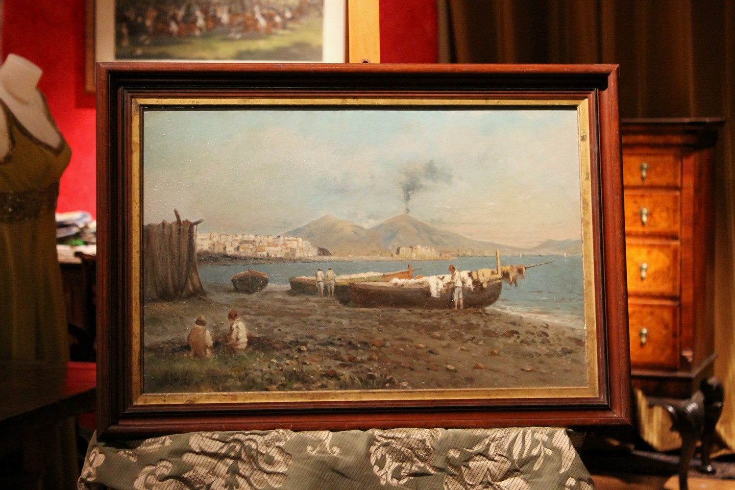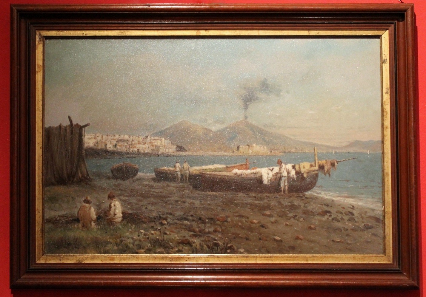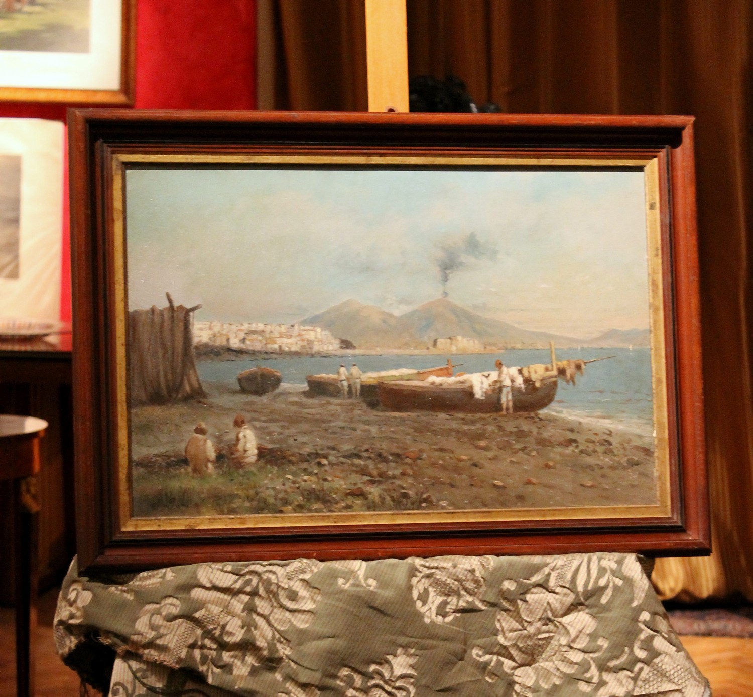 We love the neutral and natural color palette the painter used to photograph a moment of daily life in a seaside village in the bay of Naples and the wonderful texture. The marine landscape fills us with calm, numerous shades of blue, gray, green and brown are painted with strong brushstrokes that give this view a wonderful texture, lively and compact at the same time. The impressionist oil painting is very realistic but the painter manages to immerse the viewer in an evocative and romantic atmosphere with late afternoon light reflecting on the sea and the autumnal tones fine touches of white gouache pick out the light. The fishermen seem to have ended their fishing day, some are untangling their nets and others are taking care of their boats the landscape is dominated by Vesuvius in the background surrounding the bay.
