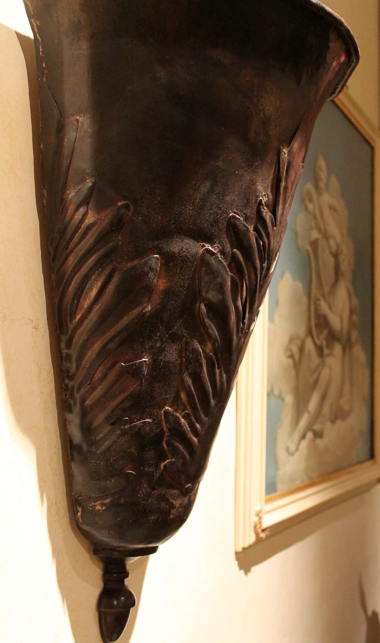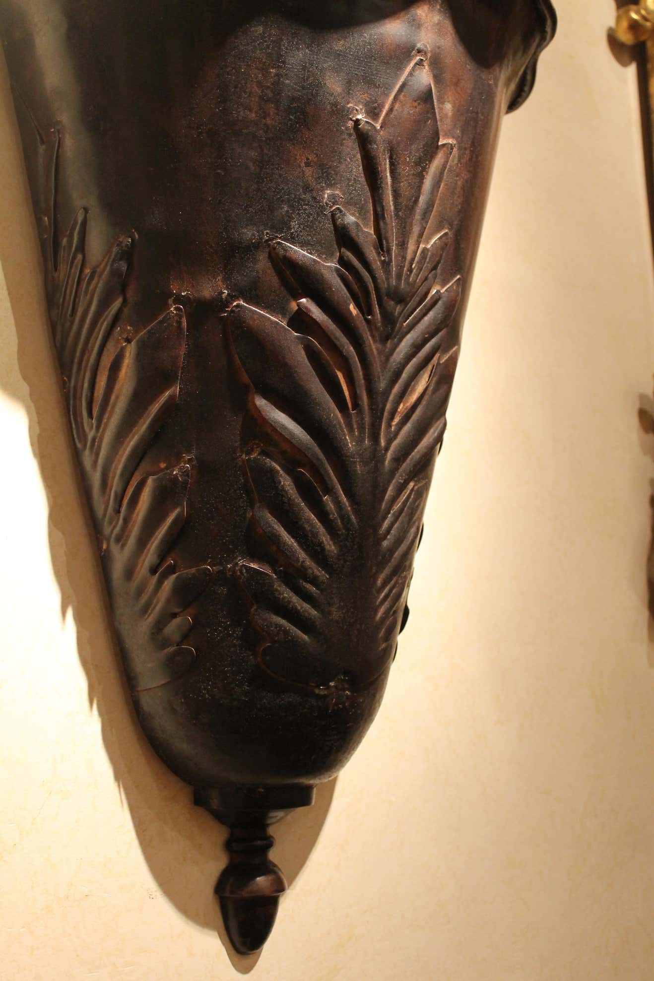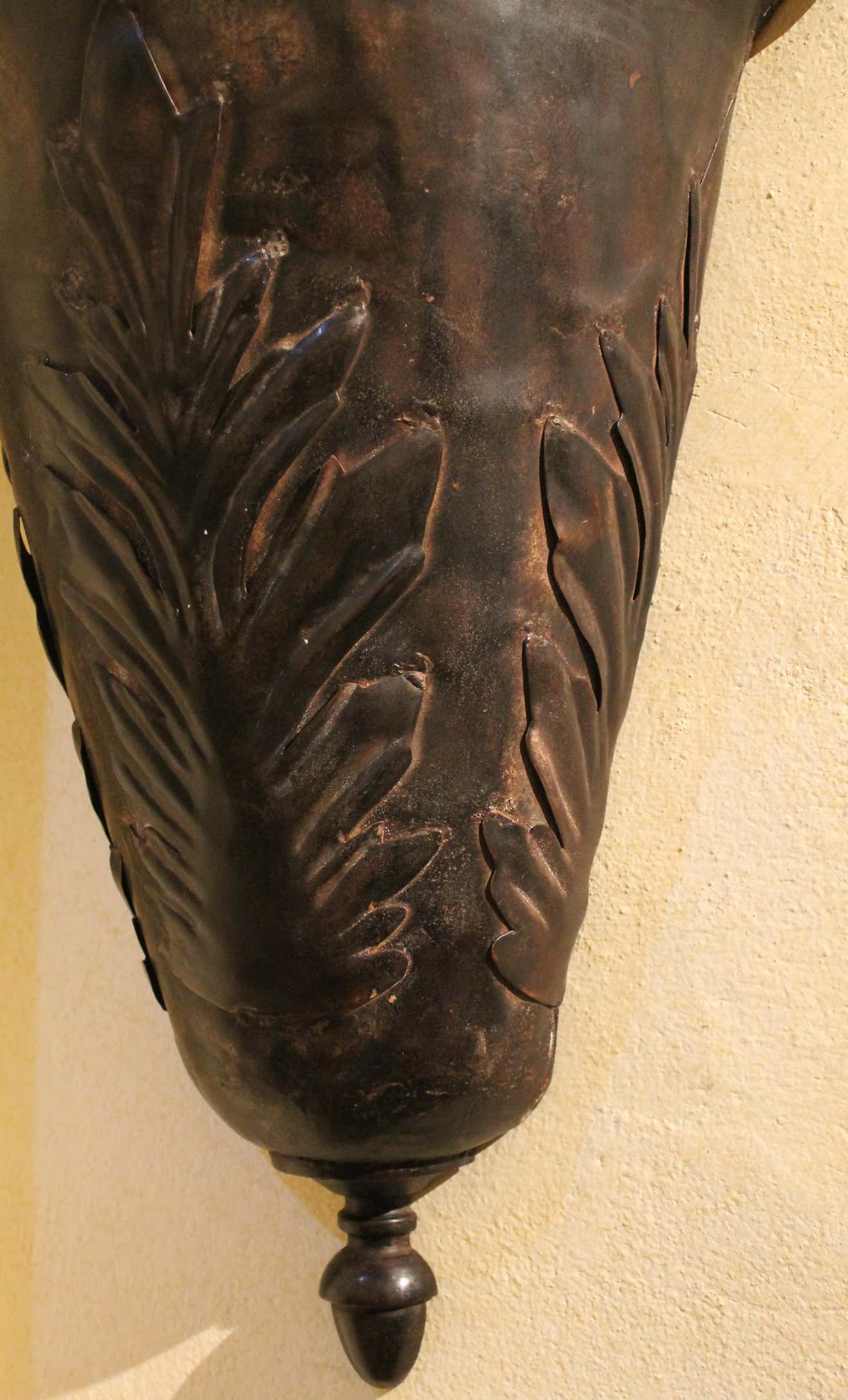 The large metal leaves on them, uncommon shape and dark painted tole finish - with an almost rusty effect - creating a perfect visual conclusion.