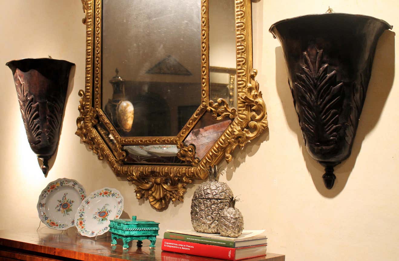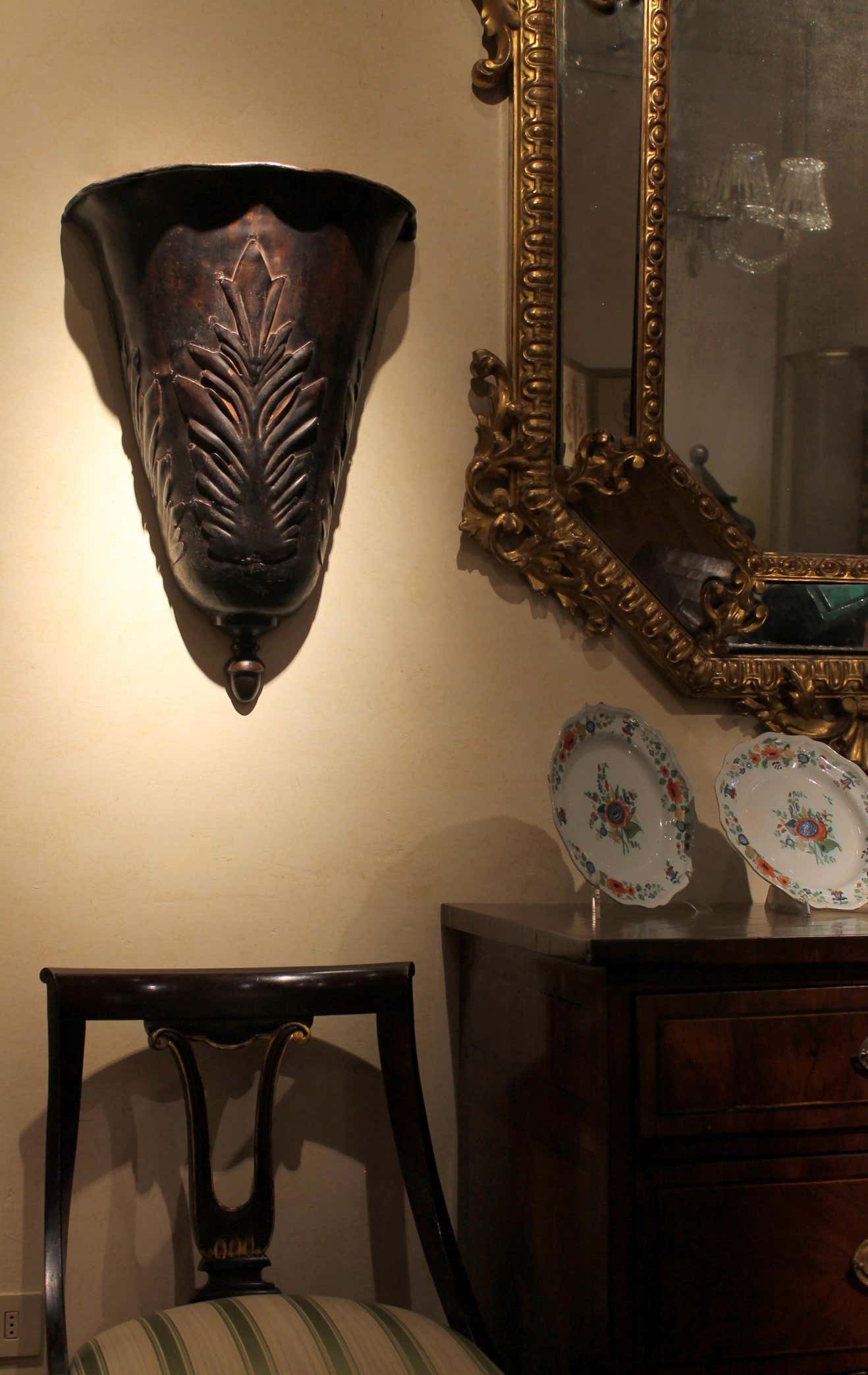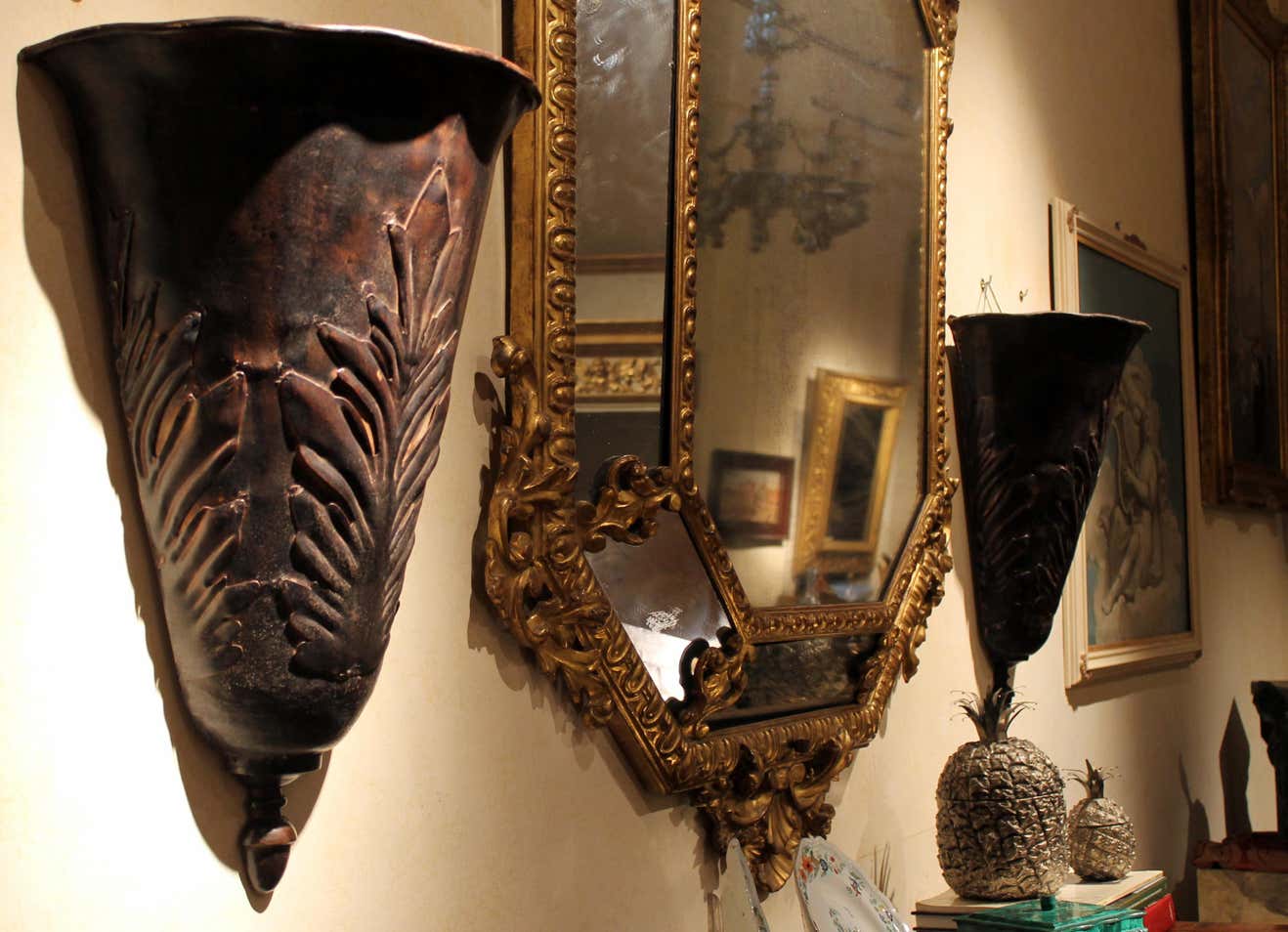 The large metal leaves on them, uncommon shape and dark painted tole finish - with an almost rusty effect - creating a perfect visual conclusion.