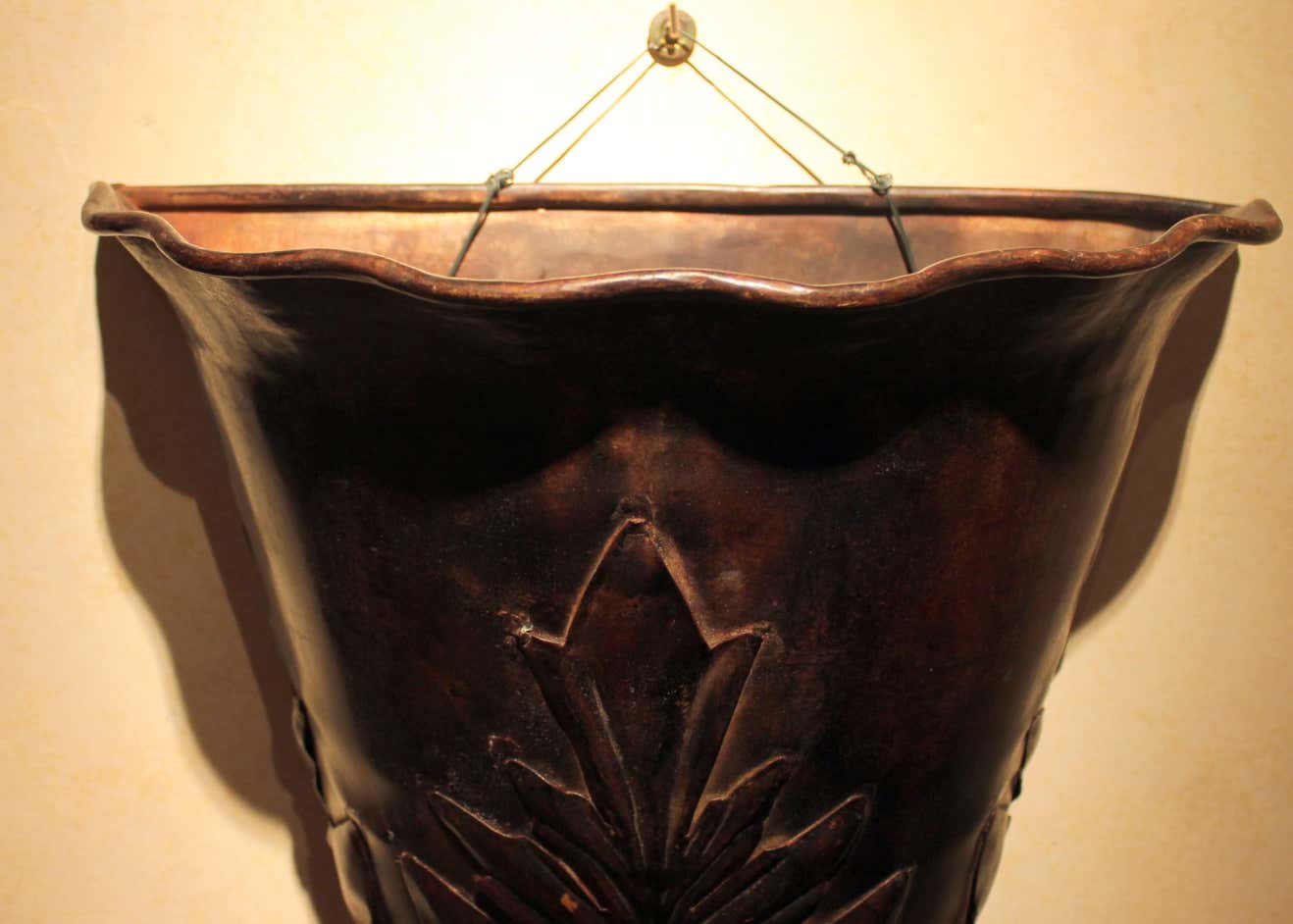 These late 19th century ( 1890s) big wall lights or plant pots feature an elegant shape, scalloped top edge, pine cone finals and are decorated with foliage motif.